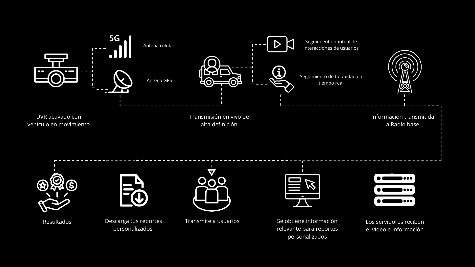 Te ofrece acceso en tiempo real a tus dispositivos, donde puedes obtener el video, realizar rastreo satelital, acceder a reportes de eventos y disfrutar de comunicación de audio bidireccional.